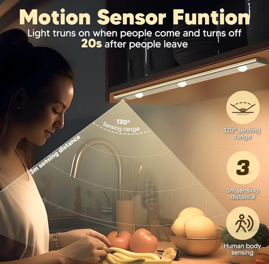 چراغ کابینت با تشخیص حرکت انسان در محدوده 16.4 فوت/120 درجه به طور خودکار روشن می شود و 20 ثانیه پس از خروج افراد خاموش می شود.  فناوری حرکت مادون قرمز ارتقا یافته آن را حساس تر می کند، خطای روشن/خاموش خودکار چراغ LED را کاهش می دهد و نور کابینت را دقیق تر و سریع تر می کند.